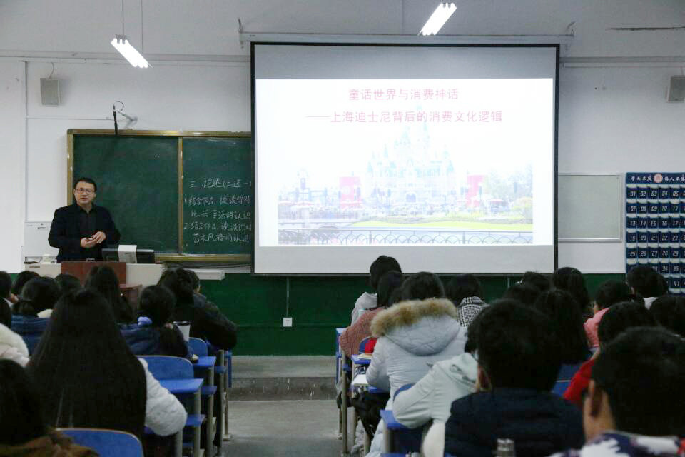 孟凡生以上海迪士尼乐园作为消费文化典范,从上海迪士尼乐园成功的因素入手,深入浅出、层层深入向同学们介绍了消费与文化的深刻关系。他借助迪士尼乐园的发展历史,通过对迪士尼乐园在中法两国的发展状况的对比,进一步介绍了迪士尼乐园的“中国元素”美式加工、消费景观、消费定位等方面的理论观念;他在讲到迪士尼乐园的“中国元素”时剖析了迪士尼是怎样进入中国市场并受到热切追捧的,进而谈了“中国元素”的嵌入及大打中国的“民族牌”对其传播的作用;同时,他还阐述了文化的魅力及其所代表的生活方式、消费理念、社会效应等的感染力和拉动性,揭示了其内在深刻含义,迪士尼乐园在中国的成功源自对中国元素的吸收与运用,这只是表面的文化策略,其背后隐藏的是更为深刻的文化逻辑。