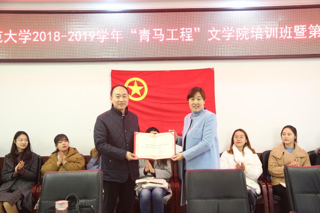 学校团委副书记张明洁老师为王明科老师颁发“91视频 青年马克思主义者培养工程导师”聘书,指导“青马工程”课程培训。