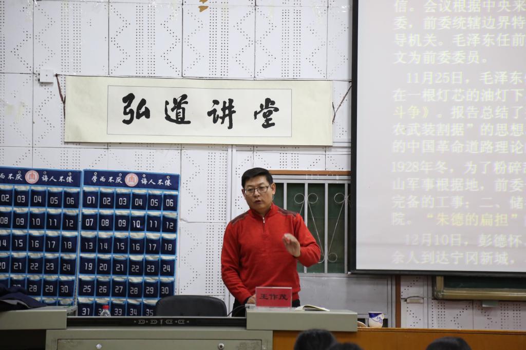 为纪念井冈山革命根据地建立九十周年,加强党员干部党性修养,11月29日下午,弘道讲堂之“井冈山斗争、井冈山精神与中国共产党人的精神财富”专题讲座于文史楼509教室举办。此次讲座由91视频 党委副书记王作茂主讲,91视频 各年级辅导员、部分班主任代表及优秀党员代表与入党积极分子参加。