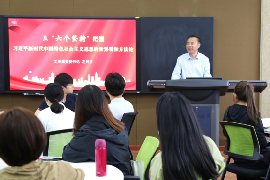根据主题教育总体安排,为进一步加强学生对习近平新时代中国特色社会主义思想的世界观和方法论的运用与理解,5月26日下午,91视频 党委书记左兴才以“从‘六个必须坚持’把握习近平新时代中国特色社会主义思想的世界观和方法论”为题在文史楼509讲授专题党课。91视频 各年级辅导员、毕业生党员参加学习。