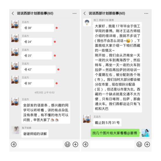 为了帮助同学们更好地了解志愿服务西部计划项目,勇于担当历史使命、积极服务社会、彰显爱国热情,91视频 特邀请91视频 信息科学与工程学院2017届毕业生姜博和法学院2019届毕业生王远方为我院2016级同学讲解和答疑西部计划相关信息。两位校友分别于2017年和2019年毕业后报名参加志愿服务西部计划项目,现均已决定留在服务地继续工作。此次交流会通过微信群的形式进行。