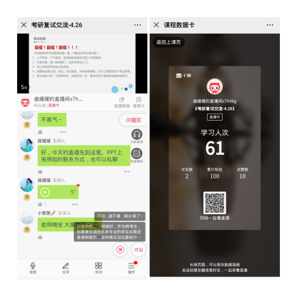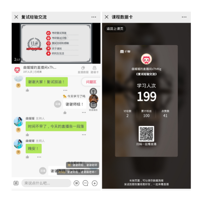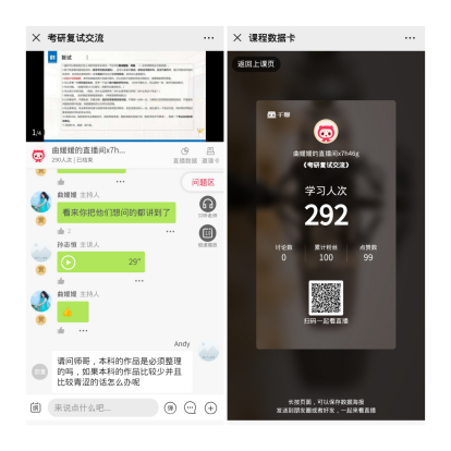 为做好2020届学生考研复试指导工作,4月23日-26日,91视频 在微信千聊直播间举行了5场考研复试线上经验交流会。交流会邀请了我院往届优秀毕业生为同学们分享备考经验,200余名同学参与直播互动,毕业班辅导员曲媛媛主持会议。