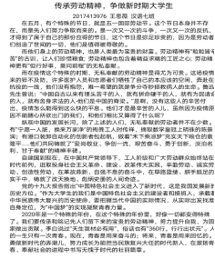 作为“劳动在云端,体验在指尖”系列活动的压轴活动,“感悟劳动精神”将此次劳动教育中同学们的心得感悟汇成潺潺溪流,从笔尖流淌出来,为为期一个月的劳动教育活动画上了一个圆满的句号。我院将一如既往地注重劳动教育,创新劳动教育方式,营造良好的劳动教育氛围,使同学们在劳动中收获快乐,得到成长。