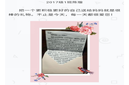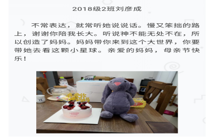 此次活动时间为4月30日至5月14日,活动通知下达后,同学们踊跃报名,积极参与到“不一样的母亲节”活动中。参赛选手用他们别出心裁的方式陪自己的母亲度过了一个特殊的母亲节,有的以书信表达对母亲的爱,有的录制视频与大家分享和母亲的温馨互动,还有的用玫瑰花收获母亲的笑容,在2020年的母亲节留下了不一样的回忆。活动以评委打分的结果确定最终获奖名单。
