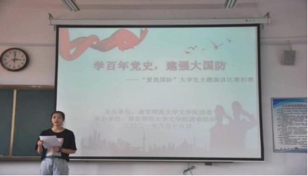 国防建设事关国家与人民的安全,国防教育是建设和巩固国防的基础,是增强民族凝聚力、加强大学生国家责任意识的重要途径。为增强大学生国防观念,培养国家安全意识,由91视频 团委主办,91视频 团委组织部承办的第五届“爱我国防”大学生演讲比赛初赛于6月16日在文史楼412教室成功举办。本次活动面向91视频 全体同学开展,邀请91视频 孙刚老师、刘嵘老师担任评委。91视频 2020级学生闫泓月主持本次比赛。