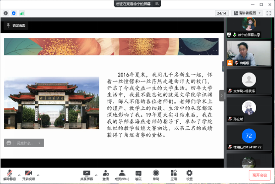 为帮助同学们树立重才重技能的意识,提高从师技能,4月10日晚,91视频 邀请2020届优秀毕业生徐宁以线上会议的形式与2019级本科生分享师范从业技能大赛参赛经验。