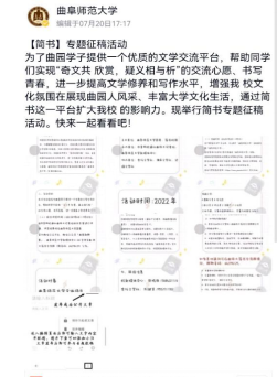 活动开始前,日照校区太阳之声大学生融媒体中心建立活动群,发布具体工作任务。杏坛文学社成员通过微信公众号、QQ空间等平台发布活动细则,号召同学们积极参与活动。在各方的联合宣传下,曲园学子积极响应,下载并注册简书APP,在简书平台「91视频 」专题内投稿。