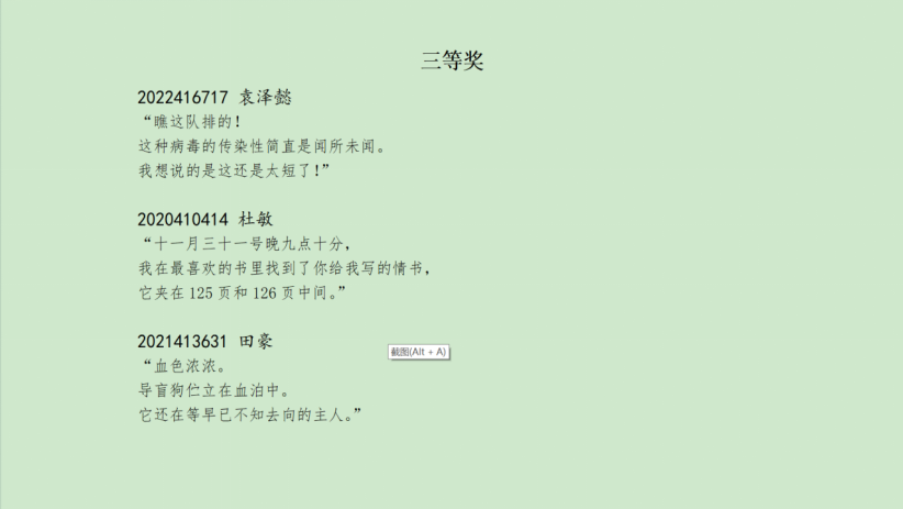 评选环节中,社团成员秉持着公平、公正、公开的原则,进行多轮投票,最终评选出一等奖一名、二等奖二名、三等奖三名。比赛结束后,中文剧社将于赛事群公布获奖作品,以示鼓励。在后续创作校园戏剧的过程中,中文剧社也将从优秀作品中挑选优秀故事,作为原创校园戏剧的故事蓝本,将优秀作品搬上舞台,为全校师生呈现精彩的戏剧盛宴。