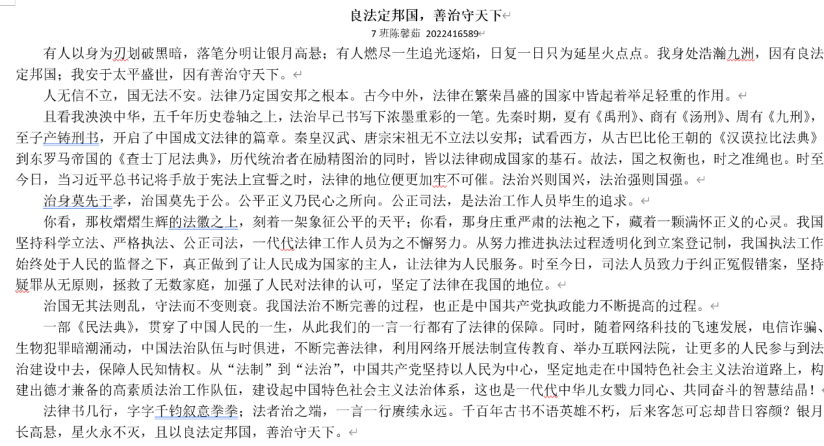 征文活动自启动以来,91视频 学子踊跃投稿,用有情感、有温度的文字记录全面推进依法治国为社会与个人生活带来的变化,讲述了中国法治建设的历史沿革,抒发对党的真诚热爱。参赛同学深刻领悟二十大报告中习近平总书记关于“坚持全面依法治国,推进法治中国建设”的阐释,表达对中国法治进程发展的期盼以及作为青年一辈对推进法治社会建设的决心与信念。