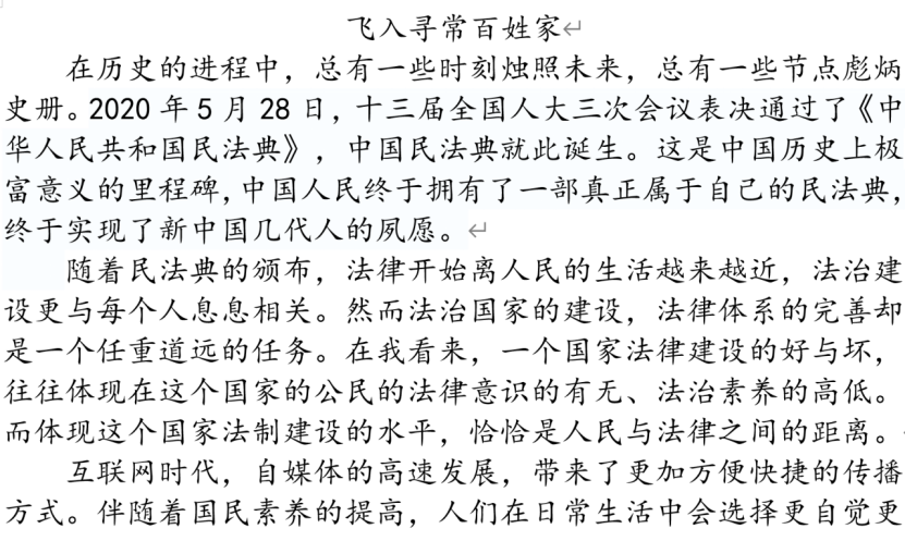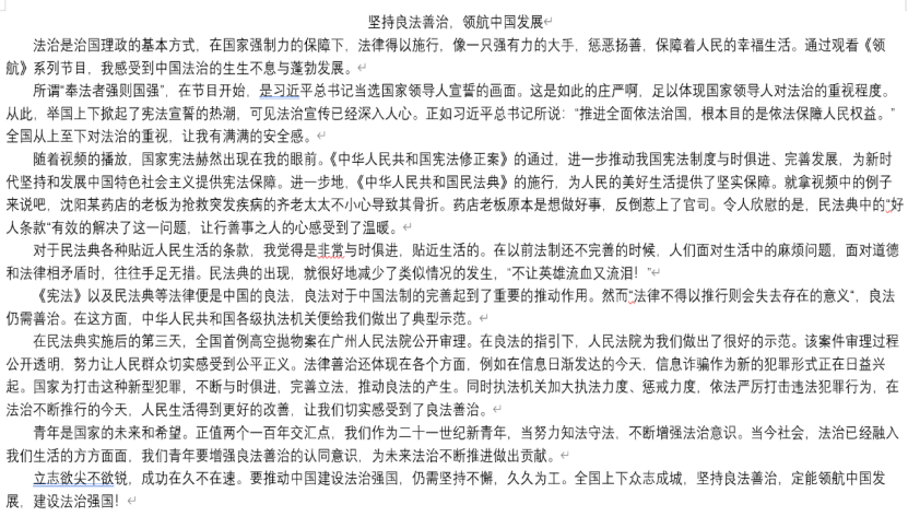 本次征文比赛采用自由投稿的形式,参赛选手将作品发送至指定邮箱,截稿后由纪检部成员进行线上评选。参赛同学观看纪录片《领航》第七集《良法善治》,从新中国法治建设所取得的巨大成就中领会党的二十大法治精神,结合自身生活实际,抒写心中所感,将法治精神内化为自己的法律意识。在创作过程中,同学们积极学习法律知识,了解依法治国方针的意义。通过不断学习法律知识,同学们不仅增强了自身的法律意识,还对党的二十大精神有了新的感悟与体会。