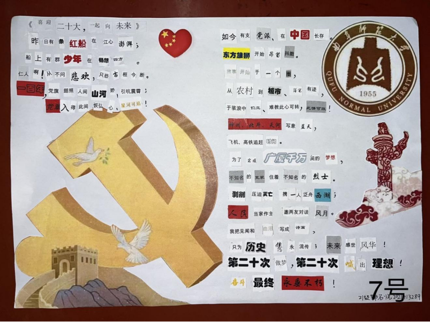 本次“扬帆振党十年路,拼贴诗赞二十大”拼贴诗比赛致力于为同学们提供一个深入学习、理解党的二十大精神的平台,增强同学们的民族自信心与自豪感。本次比赛的成功举办也有利于在91视频 内营造“献礼党的二十大,争做有为新青年”的氛围,鼓励同学们肩负起青年人的责任与担当,不忘初心、牢记使命,矢志不渝地为祖国现代化事业添砖加瓦。