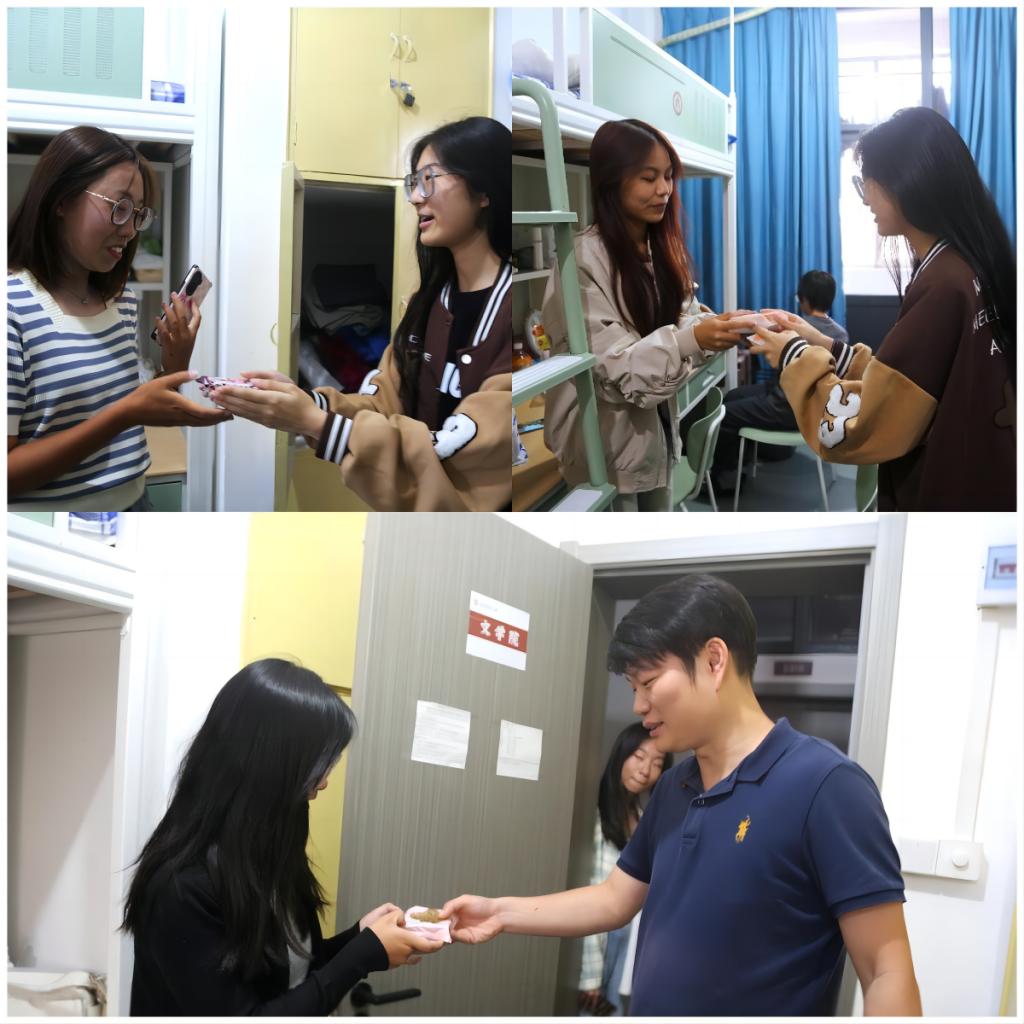 情浓中秋,关怀入寝。张乾坤带领学生会成员走进学生宿舍,为每一位留校学生送上月饼和中秋祝福。领取到月饼的同学们纷纷表示感谢,每一声“谢谢”都浸满了幸福的味道,现场洋溢着浓浓的中秋节日氛围。张老师与在校学生亲切交流,询问学生的学习生活近况及假期安排,叮嘱学生假期出行注意安全,在校期间遵守校规校纪,同时也提醒学生要及时与家人联系报平安,让家长们放心,并预祝同学们在学校过一个开心而又积极向上的中秋节。