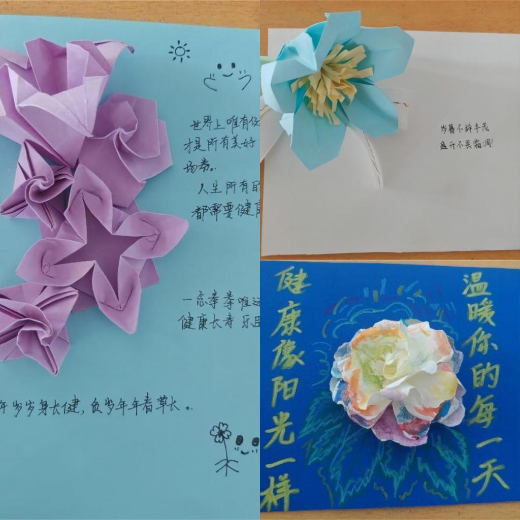 活动前期,志愿服务部的志愿者们为同学们准备好彩纸、胶棒、黑色签字笔、剪刀等物品,并让同学们根据自己的创作需要进行有序领取。活动过程中,同学们充分发挥创新思维,创造出丰富多彩的作品。用彩纸折出各色的花朵,不同的颜色代表着不同的寓意,并在作品上撰写健康标语,这些标语传递了他们对家人朋友的美好祝愿以及对健康生活的追求。活动最后,同学们积极分享有关健康生活的经验,在相互交流中学到许多有关健康生活的方法。