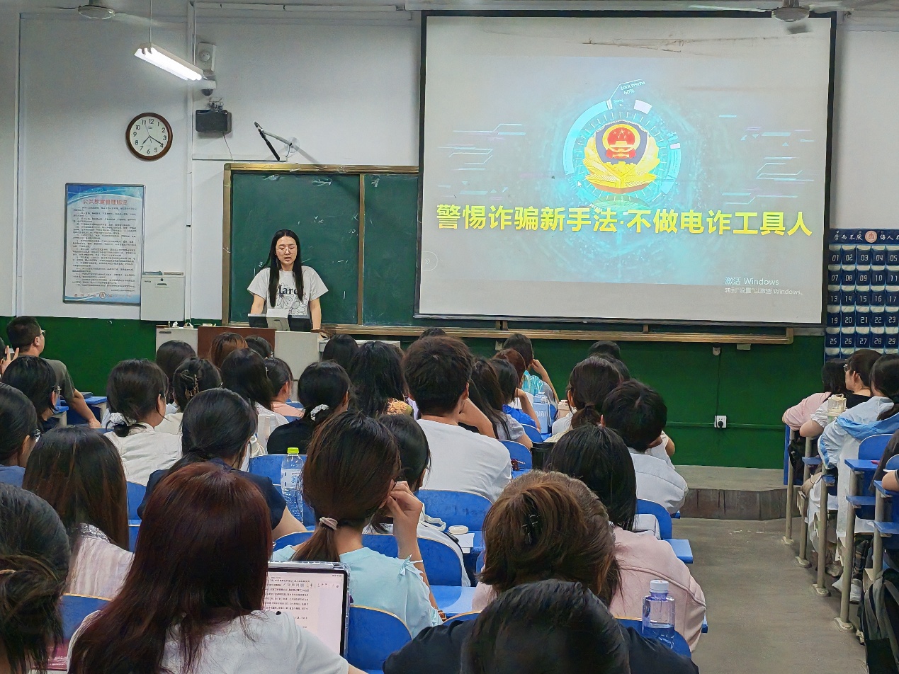 班会伊始,一段由公安机关制作的反诈宣传视频拉开了序幕。视频以真实案件为原型,揭露了诈骗分子利用心理诱导、技术伪装等手段实施犯罪的流程。触目惊心的案例让同学们深刻认识到,诈骗并非遥不可及,稍有不慎便可能落入圈套。随后,肖黎从“技术手段”“心理攻防”“法律后果”三个维度对案例展开分析。她指出,当前诈骗形式呈现智能化、精准化趋势,不法分子常以“高薪兼职”“低息贷款”等话术诱骗学生参与“跑分洗钱”或出借个人账户,导致部分学生无意中成为电诈“工具人”。班会最后,肖黎向全体学生发出倡议:增强反诈意识,牢记“要钱不给,给钱不要”八字口诀,争做校园反诈先行者。