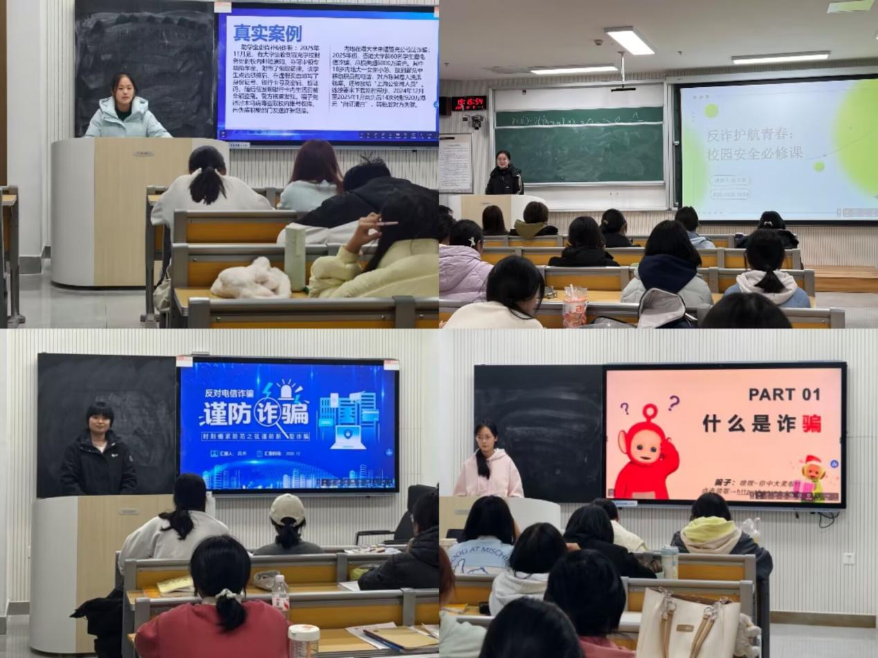 本次活动精心组织、聚焦重点,围绕电信诈骗、贷款诈骗、赌博诈骗、网络诈骗四大大学生群体中常见高发诈骗类型展开系统宣讲。在深入剖析“刷单返利”“虚假贷款”“网课退费”“游戏代充”“冒充公检法或学校工作人员”等典型骗局的基础上,重点强调并推广“不轻信陌生信息、不透露个人信息、不轻易转账汇款、遇事多核实确认”的“三不一多”防骗准则。宣讲结合大量真实案例,辅以反诈短视频、数据图解和互动问答,帮助同学们掌握识别话术陷阱、验证信息真伪、保护账户安全等实用技能,切实提升风险防范意识和应急处置能力,筑牢校园反诈“防火墙”。