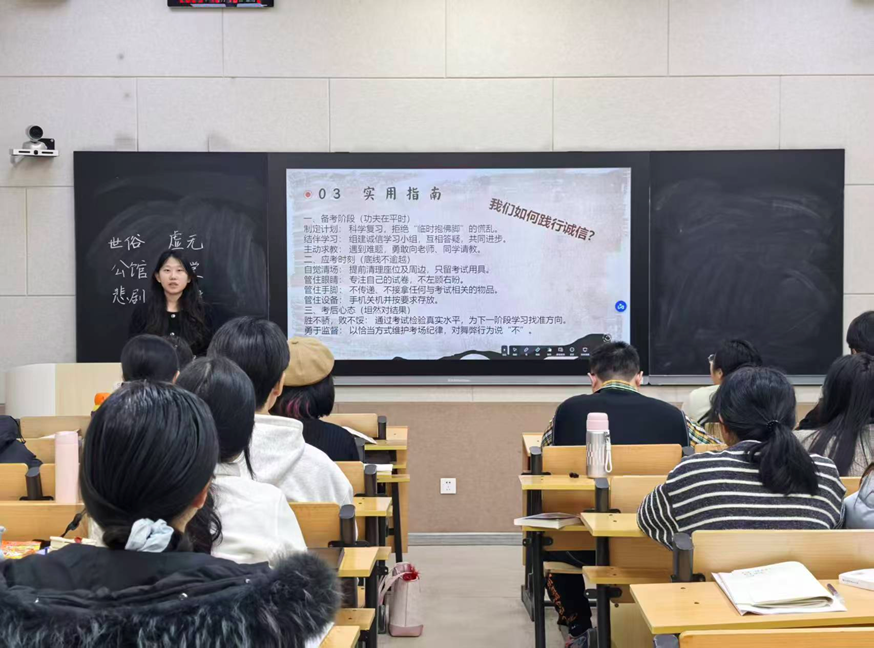 2024级2班、7班团支部侧重细节深化与互动交流,通过签署诚信考试承诺书、细化违规认定标准,让“以实力应考,以诚信立身”的理念扎根于同学们的内心。