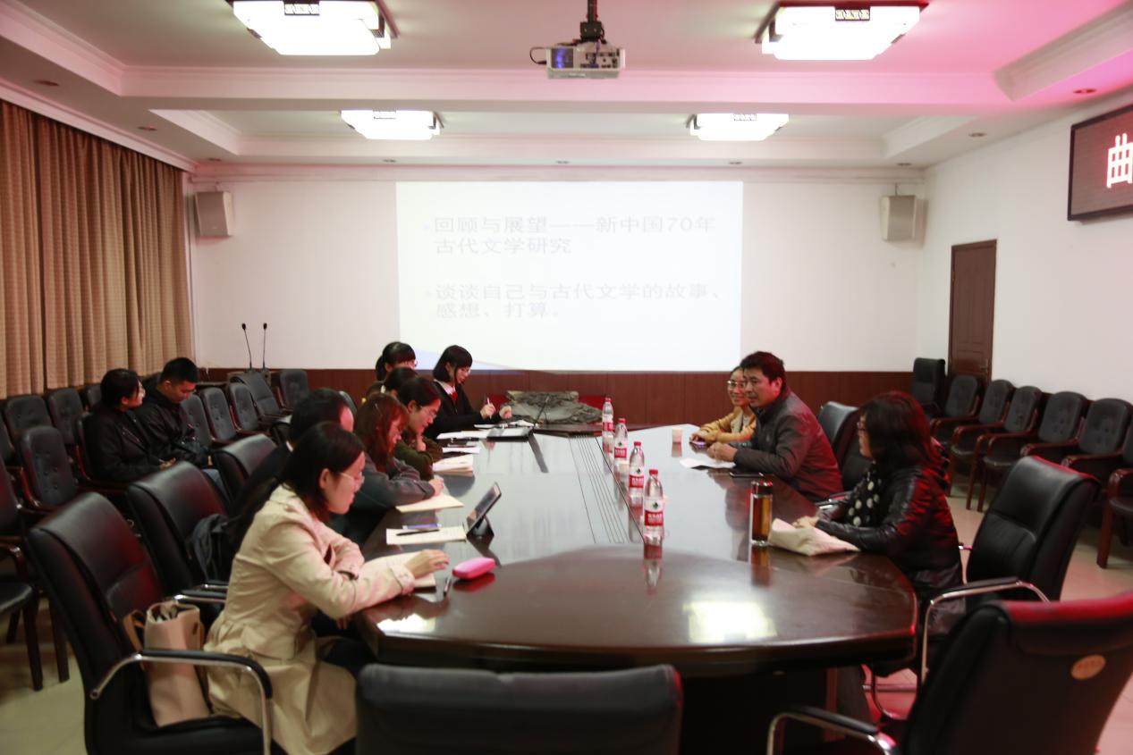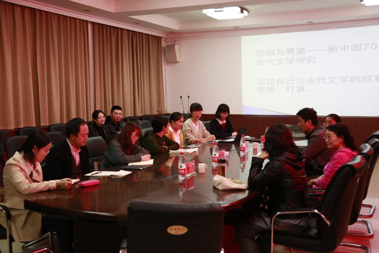 首先,本次学术沙龙在吴建国老师的主持下,由古代文学方向的研究生按年级和学号顺序依次介绍自己并表达自己在学术研究上存在的问题,由老师解答疑难。19级研究生们针对刚开始进入研究阶段而产生的紧张、无从下手的心态提出“如何摆正心态尽快进入学术研究”等问题。老师们都一一对这些问题作了耐心的回答。尤其是杨峰老师教导同学们放平心态,脚踏实地做学问并激励同学们“过去的你成就现在的你,现在的你成就将来的你”,同学们从中感受到了老师对于学生的厚望和关怀,进一步提出“如何进行学术阅读”、“如何平衡专业课学习和专题学术研究”等若干问题。吴建国老师建议同学们先“博”读书即广泛读书,再“收”即结合研究方向读书,最后读“常见书”即研究领域所公认的版本,并在阅读的同时利用电子办公软件等及时记录读书笔记,学会整理自己的观点,进行作品分析时扬长避短。李晓红老师进一步补充道“阅读及分析作品时首先以阅读文本、典籍为基础,可以结合文论或史籍如文化史、美学史、断代史等获得不同的、深刻的理解,最后综合自己的感性理解转化为理性认知形成观点”。曹志平老师则建议同学们研究论文,寻找兴趣点,找到努力方向,任何研究精读都是第一步,文献综述是第二步,要在有重点的阅读、阅读重要典籍的同时打好基础,进一步充实或补缺。各位老师结合自己的研究经历和研究经验与同学们推心置腹的交流学术经验,为同学们回答了十多个问题,点亮了同学们学术之路的指明灯。其次,2018级研究生针对本次“回顾与展望——新中国70年古代文学研究”话题对于“回归文学”提出自己对于研究方法的看法,曹老师与杨老师深入剖析了“立足文学”的文学研究方法并阐述了何为“六经注我,我注六经”,一致认为在面对流行的、多样的文学思潮和学术研究现象下更应坚持材料和方法都是为文本服务的观点,不忘初心,立足文学。最后,在老师与同学们的互动答疑中,将整个活动的气氛推向了高潮。