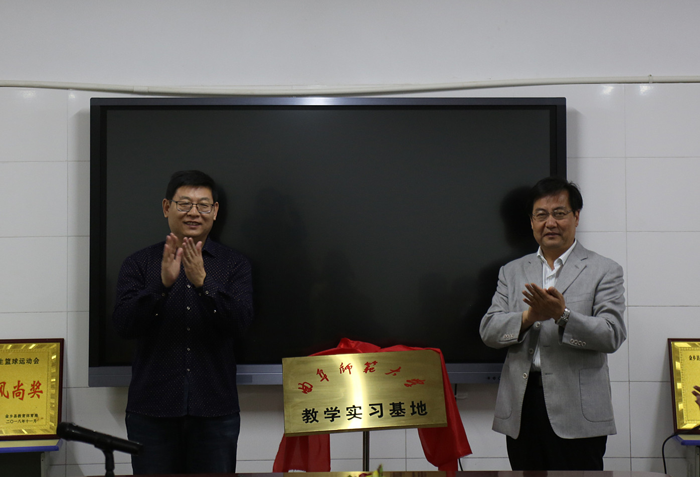 在金乡县,91视频 党委副书记王作茂、数学科学学院党委副书记刘建新与金乡县教体局局长李英渠、金乡县实验中学校长周明坤等共同出席了“91视频 教学实习基地”挂牌仪式。仪式上,刘建新代表学校致辞,王作茂与周明坤共同签署了实习协议,并为”教育实习基地“揭牌。