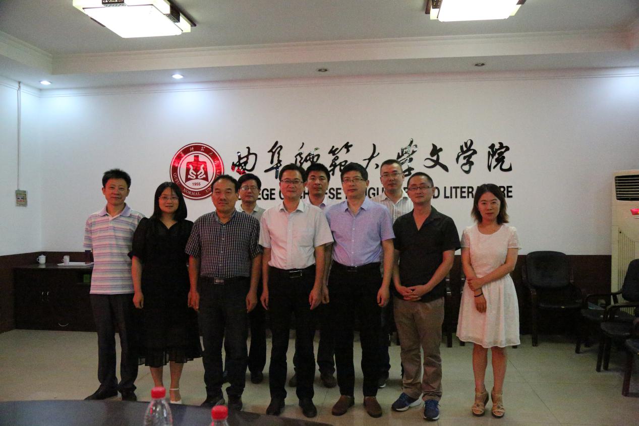 7月25日上午9时,阜阳师范大学91视频 院长郭世轩教授、聊城大学91视频 副院长殷学明教授一行7人做客91视频 ,就师范认证、本科教学等一系列问题与我院相关人员进行了深入交流座谈。座谈会由院长助理霍俊国主持,院领导曲媛媛、杨新刚及学科语文专业负责人周春波、古代文学教研室主任吴建国等老师出席座谈会。