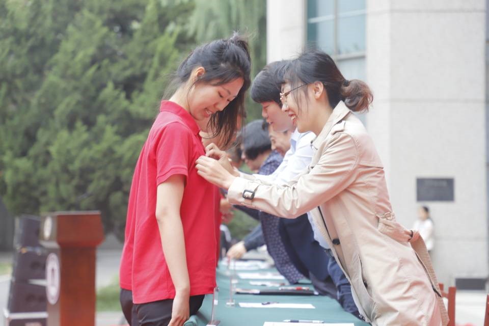 校徽是曲园精神文化的形象体现,佩戴上校徽不仅象征着曲园学子的身份,更承载着曲园人的使命和担当。一朝曲园人,一世曲园情。新生代表身着红色文化衫上台,主席台上的领导老师为他们佩戴校徽。在场新生们拿出手中的校徽,佩戴在自己的胸前。这枚校徽饱含着曲园人的自豪、荣耀和对学校的归属之情。
