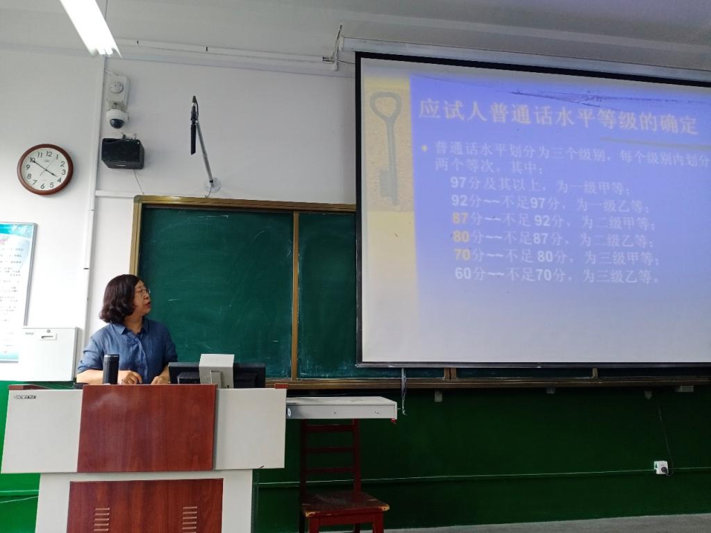 随后,杜兆金副教授根据学员的普通话水平讲解了学员常见的发音问题及解决办法,秦海燕副教授围绕普通话水平测试题目给出了教学方法和教学建议,李建校教授对培训任务中的一些重要注意事项进行了讲解。