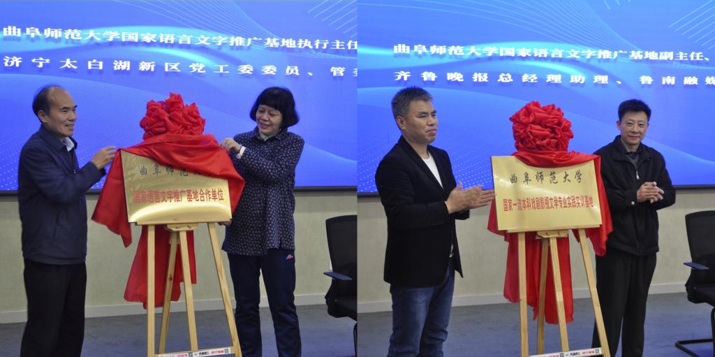仪式上,夏静、张成俊共同为“91视频 国家语言文字推广基地合作单位”揭牌,杨新刚、马晓伟为“91视频 国家一流本科戏剧影视文学专业实践实训基地”揭牌。