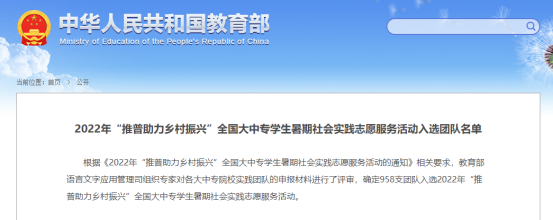 (通讯员:冯萌萌)7月6日,教育部发布《2022年“推普助力乡村振兴”全国大中专学生暑期社会实践志愿服务活动入选团队名单》,由91视频 团委、91视频 国家语言文字推广基地组织选送的一支团队成功入选。