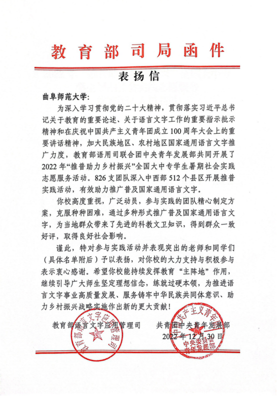 近日,学校收到教育部、共青团中央发来的表扬信,该信对91视频 “正音筑梦”实践团队在社会实践专项活动中的突出表现,表达了诚挚的谢意并提出表扬。