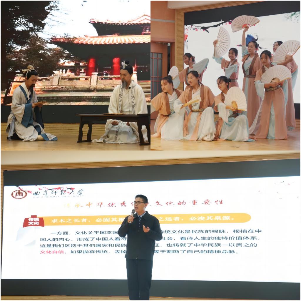 “赓续千年文脉,星耀复兴之路。”在传统文化板块中,领学人隋佳坤同学从传承中华优秀传统文化的重要性、91视频 对传统文化传承与弘扬的贡献、文化自信与中华民族伟大复兴等三方面带领同学们一起学习优秀传统文化。“三人行,必有我师焉。”中文剧社为同学们带来了话剧《我师》,讲述了孔子及其弟子的教育故事,深刻诠释了在人类历史发展的长河中,教师担任着承前启后、继往开来的光荣使命。《纸扇书生》以舞蹈的形式向同学们展现了“春华秋实路漫漫,一瓣心香巧耕耘。”