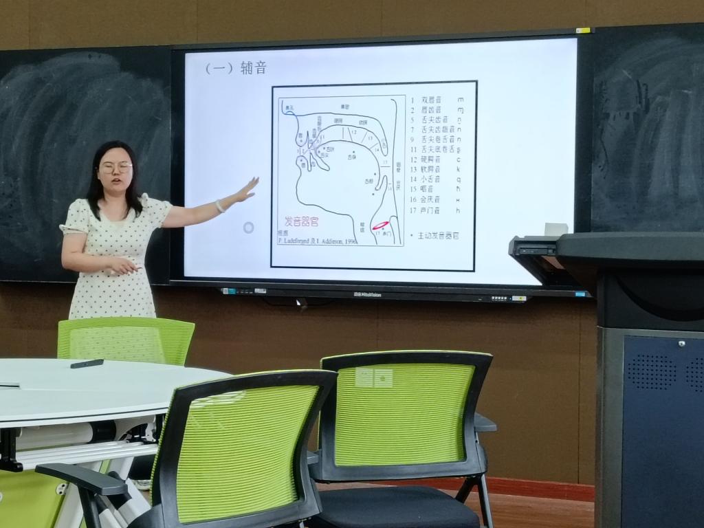 来自现代汉语教研室的姚瑞老师,选取的教学内容是“辅音与声母”,比赛共分为说课和讲课两个环节。说课环节主要介绍了本节课的教学内容,其中,涉及到了使用的教材、教学目标和教学重、难点,并对学情进行了简要地分析。在讲课环节,通过提问“辅音是什么”和“辅音都是声母吗”两个问题,引出了本节课要讲的内容——“辅音与声母”。由问题意识导入新课,培养学生带着问题思考、学习新内容的能力。在讲解辅音的发音部位和发音方法时,结合视频展示,较为清晰地展现了辅音发音的特征和不同;在学习每个辅音声母的发音时搭配着词语辨析练习,做到讲练结合。教学进程组织合理,能够选用信息技术、数字资源和信息化教学手段优化教学过程,教学方法手段运用恰当有效。