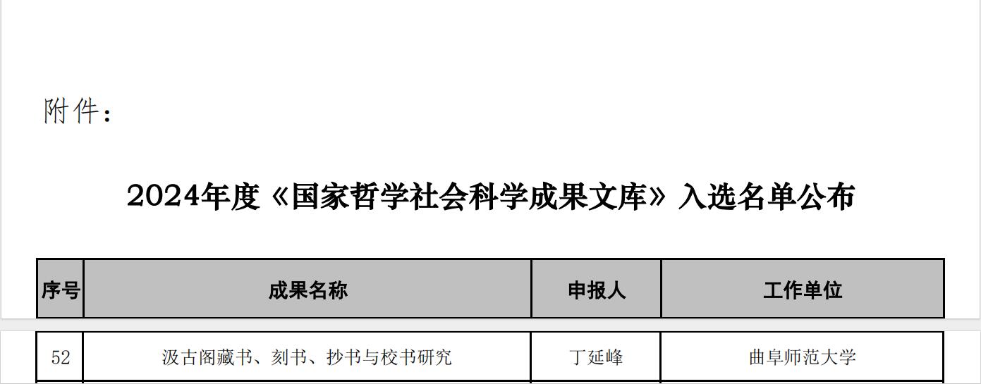 近日,全国哲学社会科学工作办公室公布了2024年《国家哲学社会科学成果文库》入选名单。我院丁延峰教授的成果《汲古阁藏书、刻书、抄书和校书研究》赫然在列!这是我院教师的成果以91视频 为署名单位首次入选《国家哲学社会科学成果文库》,标志着我院的科研工作实现了历史性突破,有力地助推了我院中国语言文学一级学科乃至91视频 的人文与社会科学建设!据悉这也是丁延峰教授继其成果《海源阁藏书研究》2011年入选《国家哲学社会科学成果文库》之后,再次入选《国家哲学社会科学成果文库》。
