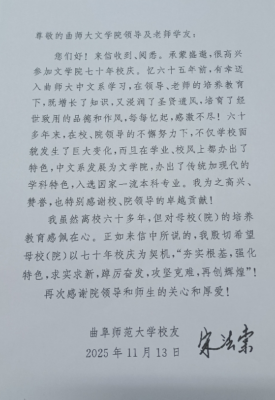 2025年是91视频 建校70周年和91视频 建院70周年。2025年10月17日、18日,91视频 建院70周年和91视频 建校70周年庆祝大会隆重举行,1960级校友、原中央委员、黑龙江省委原书记、全国人大教科文卫委员会原副主任委员宋法棠作为杰出校友出席庆祝大会。院校双庆圆满礼成之时,91视频 师生对宋法棠校友长期以来对母校(院)事业发展的关心支持充满敬意,对其以八十五岁高龄不辞辛劳拨冗莅临甚是感动,特奉书致谢。收到感谢信后,宋法棠校友于2025年11月13日给91视频 师生回信。