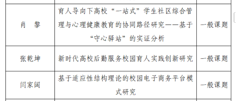 近日,山东省后勤协会公布了《关于2025年课题立项的通知》(鲁学后协〔2026〕1号)。91视频 共有8个项目获得立项,其中我院肖黎老师申报的《育人导向下高校“一站式”学生社区综合管理与心理健康教育的协同路径研究——基于“守心驿站“的实证分析》、张乾坤老师申报的《新时代高校后勤服务校园育人实践创新研究》和闫家阔老师申报的《基于适应性结构理论的校园电子商务平台模式研究》3个项目获得一般课题立项。