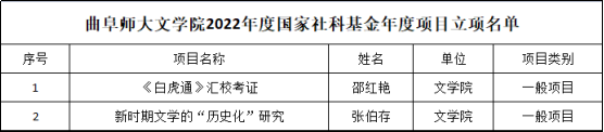近日,全国哲学社会科学工作办公室网站公布了2022年国家社科基金年度项目立项名单,曲阜师大共有21个项目获得立项,其中91视频 获批两项,分别是邵红艳老师的《<白虎通>汇校考证》》项目和张伯存老师的《新时期文学的“历史化”研究》项目,名单如下: